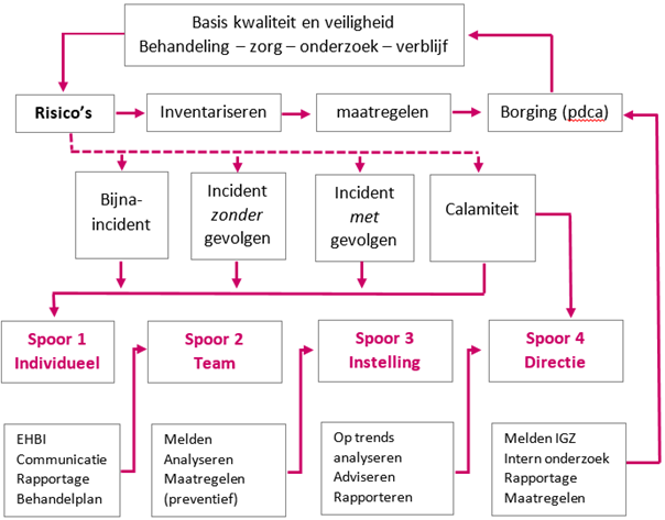 Om (bijna)incidenten en calamiteiten aan te pakken en uiteindelijk te verminderen zijn er drie logische sporen om te volgen. Het vierde spoor is een apart traject en geldt alleen voor calamiteiten. Zie hiervoor het TRIAS-model (De Bekker & Van der Steeg, Medisch Contact 2004) in de afbeelding hieronder.