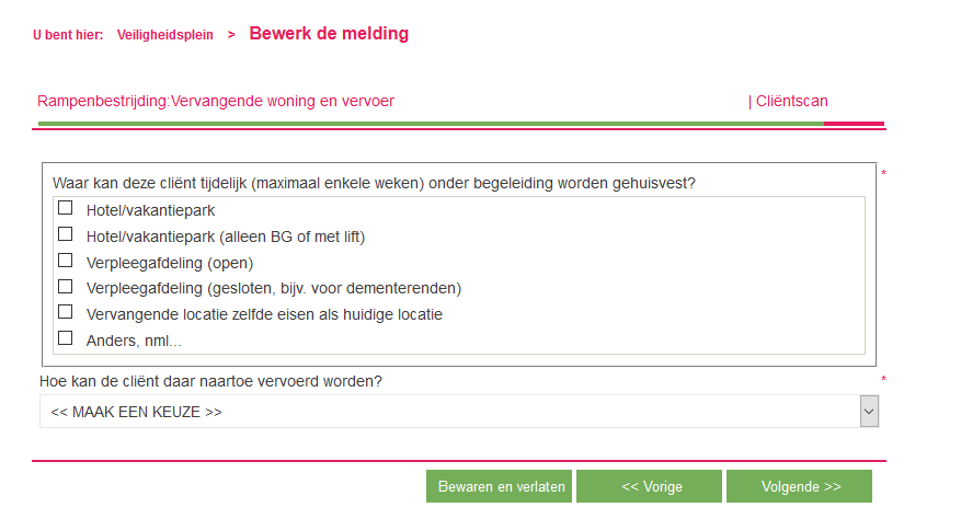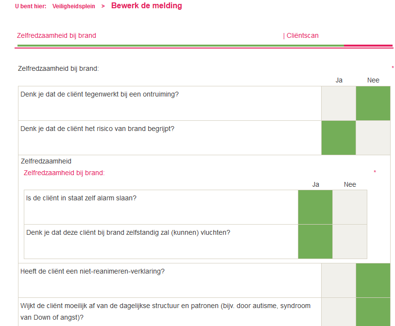 - Vul de vragen in. Als je twijfelt over een antwoord, vul dan gewoon in wat je denkt dat het beste is, het gaat om jouw actuele beeld van de cliënt.