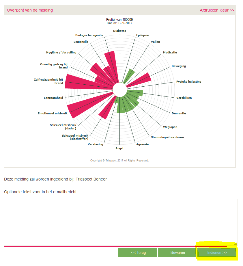 - Vul de vragen in en klik op 'Volgende'. Je komt dan op het overzicht van de risico's van de cliënt. Je ziet het nummer van de cliënt, maar niet meer zijn naam. Je kunt dit dus veilig uitprinten via de link Afdrukken kleur.