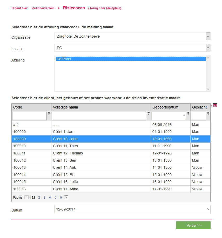 - Selecteer een afdeling van de cliënt. let op! Dit is belangrijk. Als een cliënt op meerdere afdelingen verblijft, kan hij of zij per afdeling een ander profiel hebben.