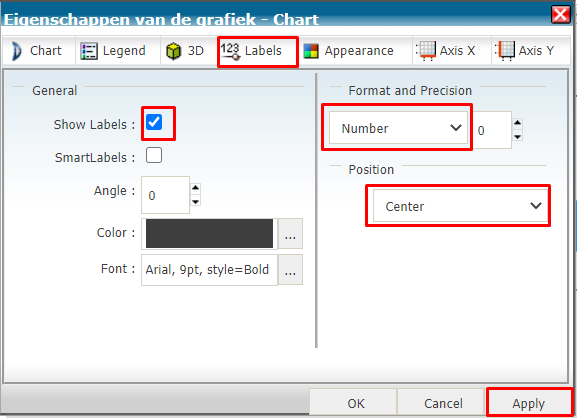 Je kan de grafiek opmaken om zo de exacte aantallen te zien. Kies voor grafiek opmaken > Properties (8e icoon van links)> tabblad ‘Labels’ en vul je onderstaande kenmerken in :