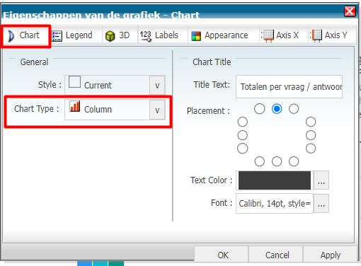 Tip: Bij hoge aantallen kan het fijn zijn het type grafiek te veranderen voor de leesbaarheid. Kies hiervoor bij Chart een ander grafiek type.