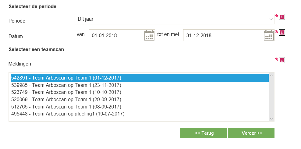 Indien gekozen is voor de Teamscan kan een specifiek team gekozen worden en kunt u één van de laatst gemaakte teamscans selecteren.