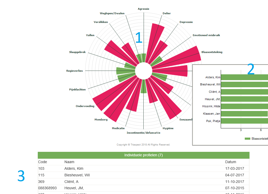 - Het geeft een overzicht van het gemiddelde risicoprofiel van alle cliënten of medewerkers van het team/afdeling.