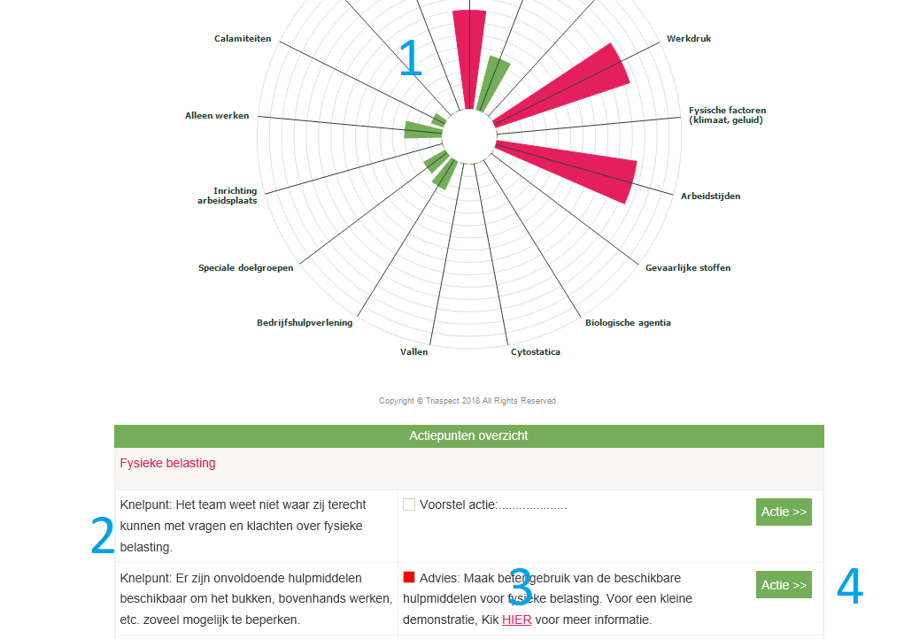 - Het geeft de uitkomst van de teamscan of RI&E als overzicht van de aanwezige knelpunten en bijbehorende adviezen, tips en links naar relevante documenten/websites/e-learning.